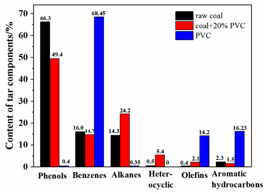 The tar component was classified into phenols, benzenes, alkanes, heterocyclic, olefins, and aromatic hydrocarbons. The product types are shown in Figure 5. It can be seen from Figure 3 and Table 3 that the maximum yield of tar was obtained when the PVC additions was 20 wt% at 600 °C. Therefore, the tar, which was produced at a terminal pyrolysis temperature of 600 °C, was analyzed using a GC-MS system. During coal pyrolysis, numerous free radicals were formed by the cleavage of bridge bonds, which existed in the coal structure [30]. At 600 °C, since there were enough free radicals in the co-pyrolysis process of coal and 20 wt% PVC, the tar yield was higher than it was under other co-pyrolysis conditions. Compared with the pyrolysis of raw coal, the content of tar components had changed during the co-pyrolysis of raw coal and PVC. The alkanes, olefins, and heterocyclic compounds increased by 9.9%, 1.7%, and 3.9%, respectively. The benzenes, phenols, and aromatic hydrocarbons decreased by 1.3%, 16.9%, and 0.8%, respectively. Therefore, the co-pyrolysis of coal and PVC increased the weight of pyrolysis tar at low temperatures and reduced the heavy component content of pyrolysis tar.