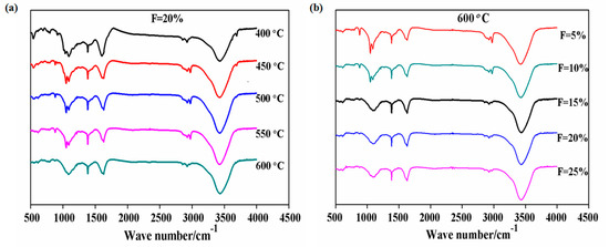 Figure 6 shows the FT-IR spectra of the co-pyrolysis product char at different terminal temperatures and PVC additions. As can be seen in Figure 6a, the PVC additions were 20 wt%, in the region of less than 800 cm−1, and the C-Cl functional group near 610 cm−1 and 690 cm−1 substantially disappeared after 500 °C. The absorption peaks of C-Cl functional groups at 610 cm−1 and 690 cm−1 are very weak and disappear after 500 °C, so chlorine mainly generates inorganic compounds. Other small peaks may represent the presence of ash in the coal and the partially substituted aromatic C-H structure. The absorption band of aliphatic hydrocarbons at 2800–3000 cm−1 gradually decreased with the increase of temperature. These oxygen-containing functional groups generated CO2 and CO during the cracking process. Therefore, the released amount of CO2 and CO increased with the increase of temperature. The hydroxylation peak on the surface of the substance near 1630 cm−1 did not change significantly, and the aromatic hydrocarbons gradually formed volatiles from the char. Figure 6b shows the char infrared spectrum of different PVC addition amounts at a terminal temperature of 600 °C. With the increase of PVC addition, the absorption peak of aromatic ether at 1036 cm−1 gradually disappeared. When PVC content was 15%, the absorption peak of aromatic ether disappeared at 1036 cm−1, and the absorption peak of aliphatic ether remained at 1092 cm−1. The C-H absorption band at 880 cm−1 gradually disappeared with the increase of PVC, which indicated it was bent in the plane to form free radicals and removed from the char. The absorption band of aliphatic hydrocarbons at 2800–3000 cm−1 gradually decreased with the increase of temperature, and the absorption peak at 1630 cm−1 also increased slightly. The aromatics at this point generated aromatic rings due to the vibration of the benzene-ring skeleton. The benzene was formed in the pyrolysis process of PVC. As the amount of added PVC increased, more aromatic rings were formed in the char.