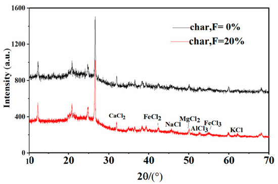 In order to explore the effect of metal elements on the migration and transformation of chlorine in coal samples, as shown in Table 5, XRF technology was used to analyze the content of metal oxides and chlorine in char. With the increase of PVC addition, the content of some alkaline metal oxides, such as Al2O3, MgO, Na2O, K2O, and CaO in the coal, gradually decreased, and the content of the chlorine element increased significantly. The reduction of the alkaline metal compound may be related to the chlorine element, whereby the char was subjected to XRD analysis. Figure 7 shows the presence of metal chloride in the pyrolysis char after the addition of PVC. The metal compound reacted with the chlorine element released in the PVC and formed metal chloride, including CaCl2, FeCl3, FeCl2, NaCl, MgCl2, KCl, and AlCl3. In the co-pyrolysis reaction of coal and PVC, chlorine was fixed in the char, thereby reducing the distribution of chlorine in the gas phase.