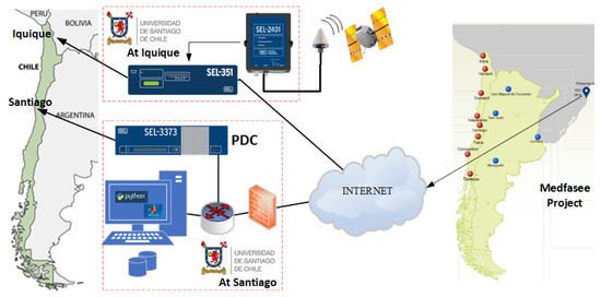 The University of Santiago belongs to a low-voltage synchrophasor network, called Medfasee (see right side of Figure 2). This synchrophasor network shares electrical variables from several places from Chile and South America [32]. The University of Santiago contributes to the Medfasee project with a PMU located in Chile’s northern town of Iquique (see left side of Figure 2).