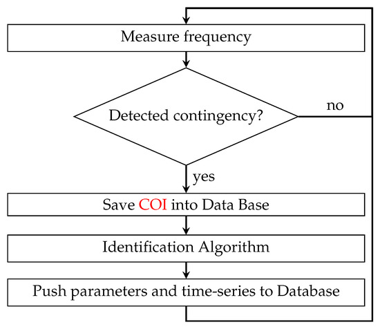 The main purpose of the algorithm is to identify the parameters of the model depicted in Figure 1 to identify actual data that is captured with the hardware described above. More explanatory details on the algorithm are found in [33,34]. The general structure of the identification algorithm is shown in Figure 5, and it was built by using Python and Matlab. The algorithm receives measured frequency uninterruptedly and detects frequency events that are suitable for identification of the dynamic parameters of the model in Figure 1 by using COI, which is approximated by using the data of 8 PMUs in the Medfasee project located in Chile.