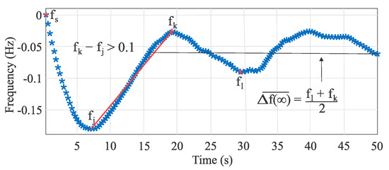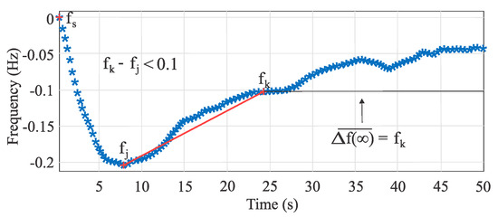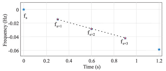 where and are consecutive time instants during the inertial behavior of system frequency after a sudden power imbalance. This definition of inertia from data is significantly sensible to the selection of and as it was observed by successive inertia estimations. Based on a database of frequency events in the Chilean power system, the first point of the frequency time series was not always in line with the rest of the slope, and the best straight line fitting the actual response was obtained by considering the second , third , and fourth points. Figure 7 shows a sketch of the inertia algorithm estimation.