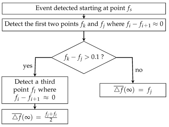 The algorithm begins measuring data from the PMU network and then considers a time-window of 240 s to have enough data from the event. After a digital filtering process to remove noise is applied, the algorithm determines if there is a pair of points (, ) that exhibit a difference larger or equal to 0.135 Hz. If that happens, the algorithm declares the occurrence of an event. The rationale behind this definition is simple; when a contingency occurs, the frequency drop/raises faster. By successive observation of measured data in the Chilean power system, the 0.135 Hz threshold was determined; see the analysis in [33] on this threshold. Clearly, this threshold definition is completely idiosyncratic to the Chilean power system, and a similar observation process must be performed if the algorithm is to be implemented in a different power system.