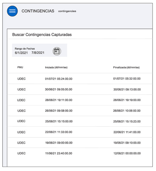 An aspect of the development that needs to be improved upon is the input of the size of the contingency that is necessary to perform the identification process. Currently, after the software has detected a contingency, the human webmaster manually check the daily report of the National Electric Coordinator of Chile (CEN) https://www.coordinador.cl/operacion/documentos/novedades-cdc/ (accessed on 1 June 2021) and manually updates the value of the power imbalance. The size of the contingency is estimated by CEN operators that examine the daily information of the SCADA system and look for large disconnections of load and generation. After that, the event is analyzed, and the size of the loss is that of the last reading of power before the event. Unfortunately, the operator’s website does not count with an application programming interface (API) to obtain the datum in an automated manner.