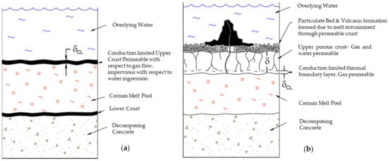 Schematic of molten corium–concrete interaction: (a) view with conduction-limited upper crust at the molten corium–water interface; (b) view with water ingression and molten corium eruption cooling mechanisms [2].
