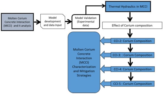 It is important to mention that the various MCCI experiments showed that the safety of a nuclear reactor during an accident is immensely affected by an increase in axial depth of concrete ablation. Therefore, to confirm the ability of the model developed in this study, the depth of concrete ablation in axial and radial directions should be compared with the experimental data. From various molten corium–concrete interaction experiments, we selected CCI-2 and SURC-2 to validate the developed model with the experimental data because these molten corium–concrete interaction experiments were executed under BWR and PWR conditions, siliceous and LCS-based concrete, and dry and dry-late flooding. The schematic adopted in this study for analyzing the effect of corium composition on concrete ablation is shown in Figure 2. Primarily, the composition of melt/corium is analyzed in detail, because the composition dictates the corium temperature and sources of heat, including the generation by fission reaction and generation through corium oxidation. Thus, it is important to understand the effect of various metals on corium–concrete interaction. The developed model can be effectively utilized to analyze the molten corium–concrete interaction with the change in corium composition in nuclear power plants. It is important to mention that, to date, the material selection during the reactor design stage is based on mechanical and heat transfer properties, and melting point values. The current study aimed to assess the effects of such materials during a severe accident and thus minimize the severe consequences in the case of an accident in a real nuclear reactor.