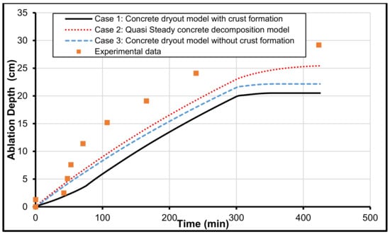 Figure 3 depicts the ablation depth for the CCI-2 experiment in the axial direction. In this study, we used the ablation depth to determine the integrity of the reactor and its containment. It is evident from this figure that sudden concrete ablation takes place once the melt/corium interacts with the concrete. However, the various models shown in the figure show that all the suggested models used in the developed model have a gradual (linear) increase in ablation. The ablation depth increases from zero to 20.5 cm, 22.2 cm, and 25.4 cm, for the dry-out concrete model without crust formation, the dry-out concrete model with crust formation, and quasi-steady concrete decomposition model, respectively. Although all models predict a similar trend, it is apparent from the various predictions that the quasi-steady concrete decomposition model results in a profile adjacent to that of the experimental data.