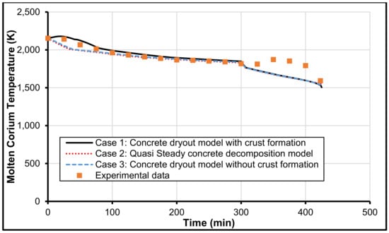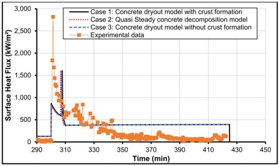 The comparisons of the melt/corium temperature and its various predictions with the developed models against the CCI-2 experimental data are shown in Figure 5. It can be observed that, although all models captured the correct trend in the temperature decay, the dry-out concrete model with the formation of crust shows the finest match with the empirical data. The analysis of experimental data of CCI-2 shows that melt/corium temperature decreases gradually until the time of coolant injection. At 300 min, when coolant is injected, all models show a sharp decrease in temperature from 1818 to about 1600 K. However, the experimental data show an increase in melt temperature from 1818 to 1873 K at 300 and 350 min, respectively. Thus, after that, the temperature immediately drops to 1670 K at 425 min. It is observed from Figure 5 that the heat flux from the melt/corium increases rapidly with the injection of water.