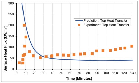 It is important to mention that the heat flux from the top boundary of the melt/corium pool is an important parameter. The experimental measurements during CCI-2 show that this heat flux from the top of the melt/corium pool almost remains at zero before coolant injection (which starts at 300 min), after which there is a spike and then a gradual hyperbolic decline in the heat flux. By comparison, all proposed models as shown in Figure 4 show a constant value of 378 kW/m2 until 424 min. It is speculated that this heat flux prediction causes a discrepancy between experimental data of CCI-2 and the ablation depth predictions shown earlier in Figure 3. Moreover, we believe that, with the injection of coolant, the discrepancy occurs due to the formation of a layer of the solid crust that develops on the surface of melt/corium (at around 305 min). After this transient, the crust thickness increases by constant coolant injection until the melt/corium is finally quenched at 424 min. Thus, with the end of MCCI, the trends in the ablation depth of experimental data and the model predictions become alike because the heat flux is equivalent.