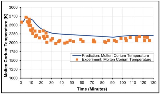 Furthermore, the various properties of concrete and its composition are depicted in Table 5, showing that the concrete used in the SURC-2 is basaltic concrete. The comparisons of the model results and the experimental data are shown in Figure 6, Figure 7 and Figure 8. These figures show the comparison of melt/corium temperature, ablation front location, superficial velocity of produced gas, and heat flux. It is evident from the various predictions that the melt/corium temperature in the initial phase of the experiment is somewhat altered from the experimental data. Nonetheless, the trend is comparable, as shown in Figure 7. It is perceived that the temperature of melt/corium increases with zirconium oxidation, resulting in an increase in the melt solidus temperature. It is imperative to mention that we considered the core and cladding mixture to be fully oxidized.
