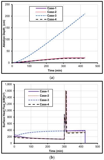 It is also apparent from Figure 10a that, after the injection of coolant, the melt temperature for Case-1, Case-2, and Case-4 drop significantly from 1870 to 1500 K, but for Case-3 it increases from 2320 K at 300 min to 2330 K at 350 min. This increase in the temperature of molten corium is also the reason for the increase in ablation depth for Case-3 composition, as was shown in Figure 9a earlier.