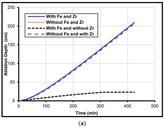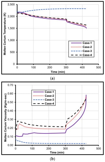 Figure 10b displays the effect of melt composition on the viscosity of the molten corium/melt. It is obvious from the results presented in this figure that, over time, the viscosity of Case-1, Case-2, and Case-4 increases as their temperature decreases. However, for Case-3, due to the exothermic chemical reactions, not only does its temperature increase over time but its viscosity also decreases. An increase in local temperature for this composition and a decrease in viscosity leads to increased ablation depth, as was shown in Figure 9a earlier.