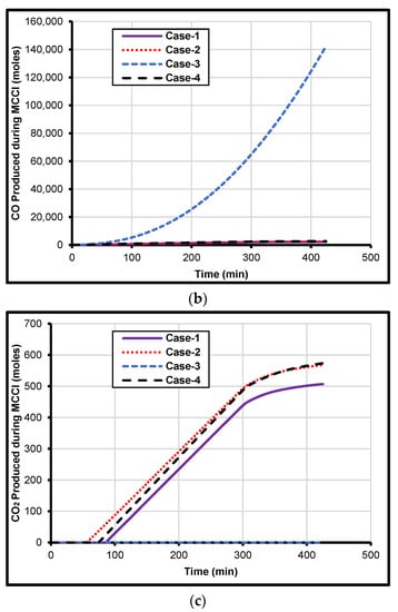 Similarly, Figure 11b shows that, for Case-3 corium, 142,000 moles of carbon monoxide were produced. However, for Case-1, Case-2, and Case-4, only 2710 moles of carbon monoxide were formed. Figure 11c displays the production of carbon dioxide with various corium compositions. The CO2 is generally considered to be the gas that mitigates the concrete ablation, decreases the temperature of melt/corium, and increases the viscosity of the melt. It can be observed that, for Case-1 corium, 500 moles of CO2 were produced, whereas, for Case-2 and Case-4, 573 moles of carbon dioxide were produced. However, for Case-3, the amount of CO2 generation was almost zero because the produced carbon dioxide is converted into carbon monoxide gas, as shown in Table 1. The analysis shows that the presence of zirconium and iron is critical in the conversion of fire extinguisher gas (CO2) to explosive gas (CO). Therefore, it is important to design the reactor such that the concentration of metals, especially zirconium and iron, is reduced to the minimum.