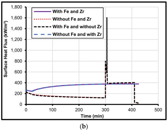 Figure 12b shows the effect of melt composition on surface heat flux during MCCI. It can be observed from the results that, for the case where both iron and zirconium are absent (scenario 2) and the case where iron is present but zirconium is missing (scenario 3), a peak occurs of about 1600 kW/m2. However, for the scenarios of Case-3 that contain zirconium (scenarios 1 and 4), no change was observed in the profile of the surface heat flux, which remained constant at 376 kW/m2, after the injection of water.