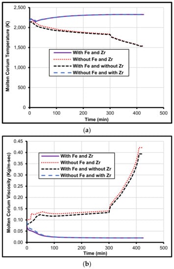 Effect of Fe, Zr, and their various combinations during MCCI at 425 min on (a) molten corium temperature and (b) molten corium viscosity.