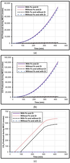Effect of Fe, Zr, and their various combinations during MCCI at 425 min on the production of (a) hydrogen gas, (b) carbon monoxide gas, and (c) carbon dioxide gas.