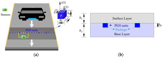 Schematic illustration of piezoelectric energy harvesting from pavement. (a) Piezoelectric energy harvester (PEH) units embedded in the road. (b) Transverse section view.
