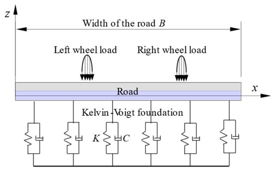 The road structure under traffic load can be modeled as a composite beam resting on the Kelvin–Voigt foundation (Figure 2), and the corresponding governing equation can be expressed as [33,34,35,36]