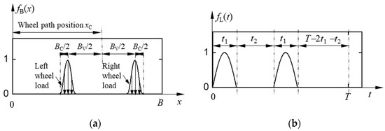 where is the amplitude of traffic load, which is directly depending on the axle loads of the vehicle; stands for the distribution of traffic load along the width direction of the road; and stands for the time-history of traffic load along the driving direction (Figure 2).