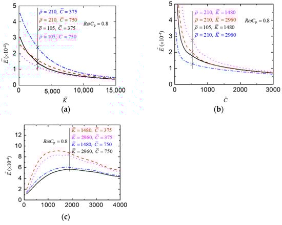 Influence of the normalized parameters of pavements (, , ) on the normalized energy . (a) Influence of normalized foundation stiffness . (b) Influence of normalized foundation damping coefficient . (c) Influence of normalized linear density .