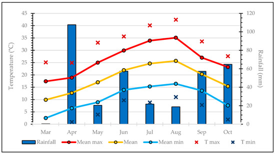 The study was conducted from March to October 2021. Temperature and precipitation data were collected during that period at the State Meteorological Agency (Agencia Estatal de Meteorología—AEMET) weather station in Alcalá de Henares (Figure 1). The absolute minimum temperature was −4.2 °C, and the absolute maximum temperature was 42.4 °C, with an average monthly temperature ranging from 10 to 25 °C.