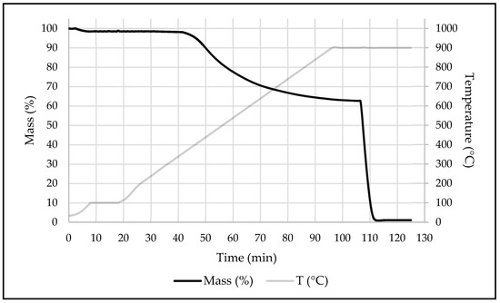 The biochar used in this study was characterized, and its properties are outlined in Table 2. Proximate analysis was performed by Thermogravimetric analysis (TGA), using a Netzsch STA 449 F3 Jupiter®. The analysis was carried out in Ar, increasing the temperature by 10 K/min to 900 °C and recording 10 min isotherms at 100 and 900 °C and a 10 min isotherm at 900 °C in air (O2/N2 80:20) (Figure 2). Three replicates were performed to ensure the reproducibility of the results.