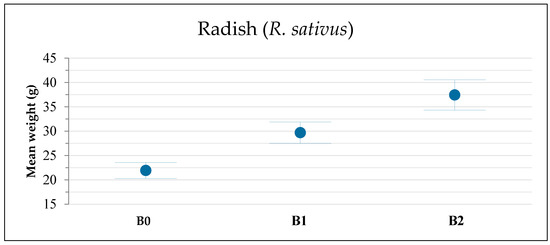 Adding biochar significantly improves the mean fresh weight of radish (Table 3, Figure 3) at both application rates (Fisher LSD; p < 0.01), with 35.4% and 70.7% increases in B1 and B2, respectively. In addition, the improvement in B2 is also significantly higher than in B1 (Fisher LSD; p < 0.01).