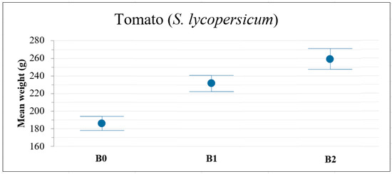 The B1 and B2 doses improved the mean tomato weight by 24.8% and 38.4%, respectively. Therefore, adding a moderate dose of biochar significantly improved tomato yield (Figure 5).