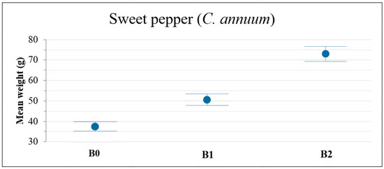 Table 6 and Figure 6 show that both biochar doses significantly improved sweet pepper yield (Fisher LSD; p < 0.01), especially in the amendment with B2, where the mean sweet pepper weight was almost double that in the section without biochar. The results of the sweet peppers grown in B2 were significantly higher than the values of the peppers grown in B1 (Fisher LSD; p < 0.01).