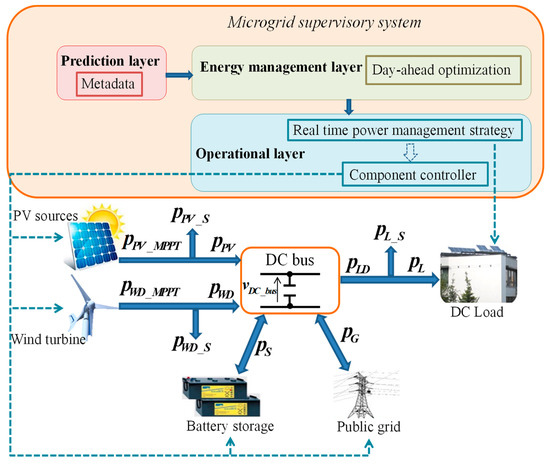 The proposed DC MG (Figure 1) is composed of its supervisory system, which consists of an energy management layer and a power management layer. The aim of energy management is to optimize the energy cost by dispatching power sources according to the PV, SSWD, and load power predictions as well as measurement data under the constraints of every physical component. The objective of power management is to control the real-time power flow for reaching power balance.