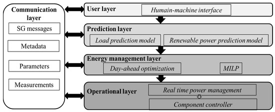 The proposed multi-layer supervisory system (Figure 2) [23] is structured into four main layers that interact among themselves and operate in at different scale times. The aim of the MG supervisory is to interact with the smart grid (SG) and the end-user. It is able to receive metadata from external sources, and keep the instantaneous power balance in the MG. Several works carried out in the Avenues unit research have been based on this structure [24,25]. Parameters refer to a group of parameters related to the MG and their physical limitations. The metadata receives the forecast data. The SG is responsible for exchanging messages and communication with the public grid. Characteristics of each layer have been explained in detail in [20].