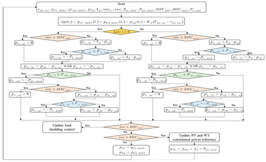 Furthermore, the proposed power management strategy consists of two extreme cases: (i) if there is a shortage of energy for supplying the load, which means that when PV panels and SSWD produce insufficient power, the grid reaches its limit, and the storage is empty. It this case, load shedding happens; (ii) if the PV panels and SSWD power production cannot be totally consumed, which means that the grid reaches its injection limit, the storage achieves the upper limit, and the load is fully supplied or cannot consume enough, the PV and SSWD energy should be limited.