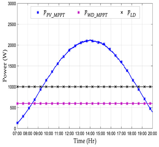 In order to study the shedding coefficients, arbitrary power curves were selected (Figure 4). As can be seen, the maximum power provided by the WT was limited and fixed to 600 W, which was the maximal limit of the studied SSWD. The load power curve was fixed at 1000 W. The PV power curve was calculated according to the weather data recorded on the 29 June 2019 in Compiegne. In addition, the selected simulation time horizon was from 07:00 until 20:00. During this period, the DC MG operated only in on-grid mode.