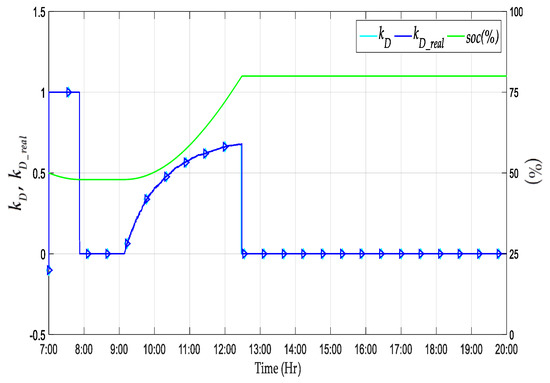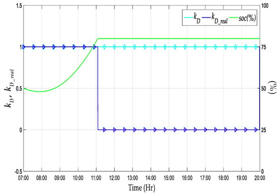 First, in Figure 5, the was set to 1 during the period of 07:00–11:05, meaning that only the storage was used. In the period 07:00–08:00, the decreased first which indicated that the storage was discharging. After that, in the period 08:10–11:05, the storage started recharging, which is explained by the increase in the . At 11:05, should switched to 0 () and stabilize at the upper limit (80%). It is crucial to mention that the evolution of is the same whatever the value of PV or SSWD shedding tariff.