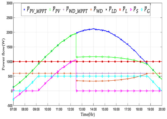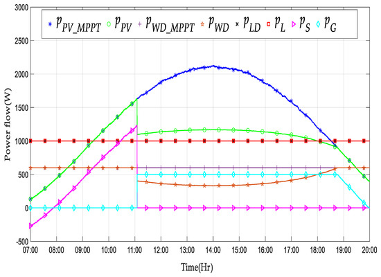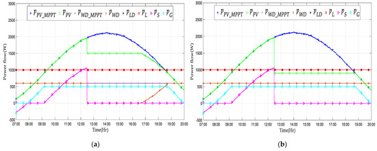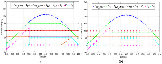 Concerning the power flow provided in Figure 9a,b, the period from 07:00 to11:05 was characterized by using the total power produced by PV sources (blue line) and the SSWD (purple line) to supply the DC load (red line) and recharge the storage (magenta curve). At 11:05, the storage was full, and turned into 0, letting the public grid (cyan bleu curve) ensure the power balance. At 11:05, the load was fully fed (1000 W), the storage was completely charged (1300 W), and the grid had reached its limit of injection (500 W). Then, the excess of power from PV and SSWD should be limited. Since takes into account the shedding tariff of each source, a difference in the amount of power that should be limited from each source was then noticed. The blue and purple curves are, respectively, the and the that are normally provided and the green and the brown curves, ( and , respectively) show the limited powers that should be provided to meet the power balance. It can be noticed in Figure 9a () that the SSWD power was totally limited (the SSWD turned off) in the period from 11:05 to 16:40, while the rest of the power was limited from the PV source. However, when (Figure 9b) and since an important amount of power was produced by PV sources, only these later were limited and the SSWD continued to produce at its maximum power. At 18:40, the power balance was again ensured by the public grid that was injected until 20:00.