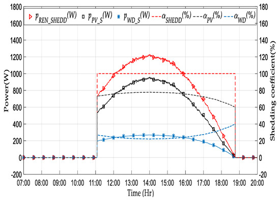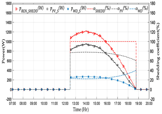 Figure 13 presents the period where the PV and SSWD shedding occurred in the case of optimization. As can be seen in this figure, the amount of power that should be shed by each renewable source was calculated using the coefficient. The duration of shedding lasted for 6 h and 10 min (12:30–18:40). Therefore, in order to compare shedding powers of PV source and the SSWD (black square and blue star markers, respectively), percentages (black and blue dashes lines) were calculated depending on the total power that should be shed (red triangle marker) and the coefficient. The results in Table 5 were identical whatever the used tariffs ( or ). In fact, constituted around 76% of , while reached 24% of this power. Thus, applying coefficient provided the same distribution of power that should be shed from each source without taking into account the shedding tariffs.
