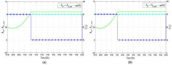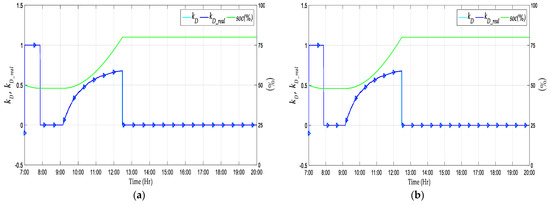The evolution of , , and in the simulation without optimization by applying the coefficient are shown in Figure 8a,b. During the period from 07:00 to 11:05 the was set to 1, which indicated that only the storage was used, while represents the real value of during the simulation depending on the use or not of the storage. In the period between 07:00 and 07:55, the decreased, which means that the storage was discharging, while in the period from 07:55 to 11:05, the increased until reaching the upper limit. At 11:05, switched to 0 () and the stabilized at 80%.