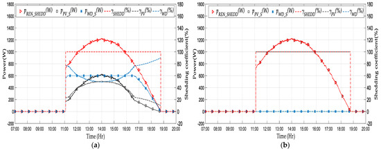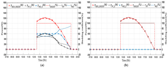 Figure 10a,b present periods where the shedding occurred for PV and SSWD in the case of storage priority by applying for and , respectively. As can been seen in these figures, the amount of power that should be shed by each renewable source was calculated using the coefficient and different shedding tariffs. Durations of shedding were identical (7 h 45 min). Nevertheless, in the case of , both PV sources and the SSWD (black square and blue star markers, respectively) were contributing to limiting the (red triangle marker), while in the case of , only PV sources were responsible for the power balance ( and lines are combined). Thus, in order to compare shedding powers of PV sources and the SSWD, respectively, percentages (black and blue dashes lines) were calculated depending on and the coefficient. Table 4 provides these percentages according to the simulation cases. The results clearly showed that in the case of , and constituted 40.2% and 59.8% of , respectively. Otherwise, when , only PV sources were limited (100% of ).