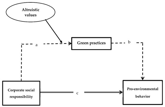 Although values provide a foundation for behavior formation, nevertheless, values only provide a general basis to guide one’s behavior in a specific context. This indicates that, instead of examining the direct role of personal values on individual behavior, it is more important to test the moderating effect of such values in a specific framework. Buttressing this, Al-Ghazali and Afsar [61] discussed the conditional indirect role of employees’ green values to spur employee green creativity in a green human resource framework. Similarly, the moderating role of personal values to guide the purchase behavior of individuals for low-carbon emission cars was also discussed recently [54]. In the same vein, the conditional indirect role of employees’ green values in a transformational leadership framework was tested by Zhou et al. [62]. They reported a positive conditional indirect effect of green values between the mediated relationship of transformational leadership and green product development performance. From the perspective of CSR and PEB of employees, the recent work of Shao et al. [20] highlighted the important role of altruistic values to spur employees’ PEB. To summarize the above debate, it can be stated that there is a clear role of individual values to form a behavior. However, the general nature of values requires a specific context to guide the behaviors of individuals in a specific direction. In this aspect, altruistic values stress the well-being of others, which is also the subject of a socially responsible organization that takes different measures through its green practices for a sustainable future. When combined, CSR and green organizational practices are generally believed to enhance PEB at the level of employees. However, employees’ altruistic values provide further strength to this relationship. Therefore: