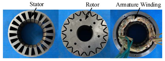 Figure 1 shows the prototype of the proposed 20/18-pole five-phase FTPMSM [21]. Owing to the single-layer concentrated winding and fault-tolerant tooth used in the stator to achieve phase isolation, a good fault-tolerant capacity can be achieved. Meanwhile, the adoption of single-layer concentrated windings will bring about MMF harmonics [22]. To overcome this problem, uneven air gap technology is adopted. The centers of the stator and rotor are not set the same. Then, by optimizing the eccentricity height of the rotor, the ideal sinusoidal back-EMF can be achieved. Additionally, the cogging torque can be reduced. Therefore, with the special design, this five-phase FTPMSM can possess high fault tolerance while ensuring good basic performance.