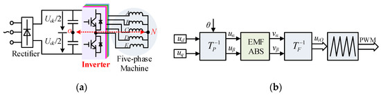 - A five-phase inverter is shown in Figure 3a, where N is the neutral point of the inverter, O is the midpoint of the capacitor, uiN (i = A,B,C,D,E) is the phase voltage, and uiO is the pole voltage. Usually, the inverter works by directly modulating the pole voltage. Nevertheless, in the case of an open-circuit fault, the phase voltage of the fault phase is modulated PWM thanks to the shift of the neutral point, which will affect the PWM modulation of the motor under the fault condition. In response to this problem, the existing literature generally adopts the back-EMFs compensation to weaken the influence of oscillating neutral, as shown in Figure 3b, but this scheme needs to add an additional back-EMFs compensation module, which is not beneficial to the minimal drive system reconfiguration under fault-tolerant operation.
