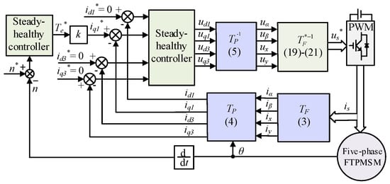 The FOC drive structure block diagram of the five-phase FTPMSM under the normal operation is shown in Figure 2. For a five-phase FTPMSM with a five-phase drive, the additional power loss is generated by the third harmonic component in the d3-q3 subspace. Thus, this component should be controlled to zero. To further suppress the third harmonic current, two closed-loop current controllers are added in the d3-q3 subspace. From Figure 2, it can be seen that based on the coordinate transformation matrices of the five-phase motor system, the FOC operation of the five-phase FTPMSM can be realized by adopting the corresponding PWM generation method.