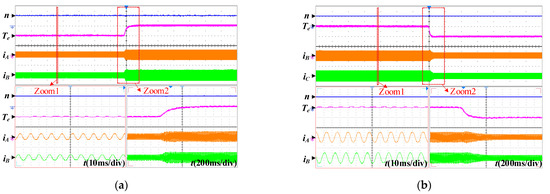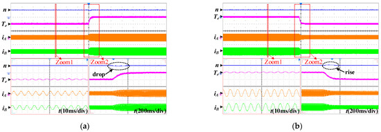 Dynamic responses with the changed load in healthy operation for the proposed FOC (500 rpm/div, 2 Nm/div, 5 A/div). (a) Increased load. (b) Reduced load.