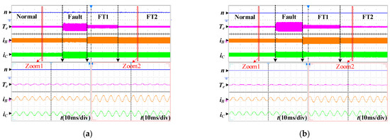Figure 8 presents the conventional and proposed FTC drive systems in healthy, fault, and fault-tolerant operation at phase-A open-circuit fault state. In the experimental waveforms of traditional fault-tolerant vector control, the operation state of ‘FT1’ refers to the FTC strategy based on PI controllers that uses traditional reduced-order decoupling transformation matrices and does not adopt the back-EMFs compensation. The operation state of ‘FT2’ refers to the FTC strategy based on PI controllers that uses traditional reduced-order decoupling transformation matrices and the back-EMFs compensation. In the experimental waveforms of the proposed fault-tolerant vector control in this paper, the operation state of ‘FT1’ refers to the FTC strategy based on the steady-healthy controllers that adopts the traditional reduced-order decoupling transformation matrices and does not adopt the back-EMFs compensation method. The operation state of ‘FT2’ refers to the FTC strategy based on the steady-healthy controllers that adopts the modified reduced-order decoupling transformation matrices. From Figure 8a, it can be known that the torque ripple is restrained to some extent in the FT1-operated state compared with that at fault state. Additionally, the fault-tolerant currents are consistent with the theoretical derivation. By adopting the back-EMFs compensation method, the torque ripple can be further suppressed at the FT2-operated state, and the amplitude of fault-tolerant currents can be kept unchanged. Then, it demonstrates that the back-EMFs compensation can effectively weaken the impact of oscillating neutral. From Figure 8b, it can be observed that compared with FT1 operated state, the torque ripple in FT2 operated state is significantly reduced, which can be comparable to that under normal operation. Thus, the effectiveness of the modified reduced-order decoupling transformation matrices proposed in this paper can be verified.