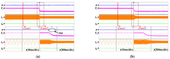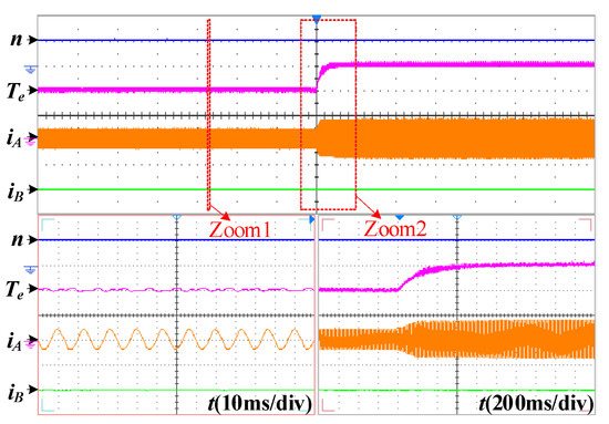 The dynamic waveforms of the conventional and proposed FTC scheme with a decreased load at phases A open-circuit fault-tolerant operation are shown in Figure 9. It can be found that both schemes can realize speed tracking under sudden load reduction, but the speed of the proposed fault-tolerant FOC system is hardly affected by load changes. Furthermore, the dynamic waveforms of the proposed FTC scheme with an increased load at phases A open-circuit fault-tolerant operation are shown in Figure 10. Comparing Figure 9b and Figure 10 under fault-tolerant operation with Figure 7 under normal operation, it can be summarized that for both at normal and fault-tolerant operation, the good disturbance rejection capacity and dynamic performance can be obtained under the proposed drive system.