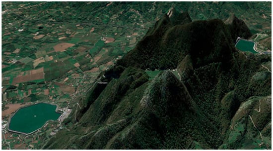 Google Earth synthetic image of a Gigawatt-rated off-river PHES site at Presenzano in Italy, showing the two reservoirs (upper right and lower left) with a head of 500 m (vertical scale exaggerated). Map data ©2021 Google.