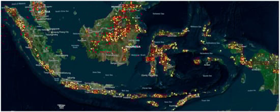 Potential 150 GWh Greenfield off-river pumped hydro energy storage sites in Indonesia (Source: [18], detailed zoomable map is available at NationalMap [18], Available onlne: http://re100.eng.anu.edu.au/ (accessed on 1 March 2022)).
