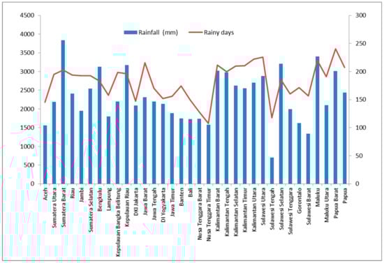 Indonesia is a tropical country with annual rainfall varying over the regions. The lowest rainfall occurs in Nusa Tenggara Timur province, with an annual rainfall of 700 mm. The highest is in Sumatera Barat with 3838 mm. On average, Indonesia has population-weighted rainfall of 2221 mm per year [33] (Figure 4).