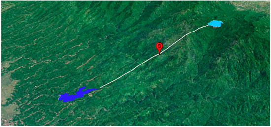 A 50 GWh Class B site in Jembrana Regency, Bali Province, is used as an example of desktop analysis. Figure 7 illustrates this hypothetical site: an upper (light blue) and lower (dark blue) reservoir connected with a tunnel (white line).