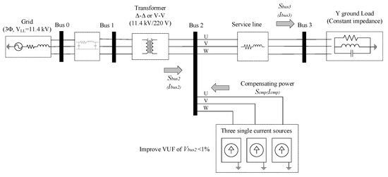 The user side was defined behind Bus 2, including the service wires and lumped load. The proposed compensation current source was connected to Bus 2. The injected three-phase currents were determined by the PSO algorithm to balance the voltage at Bus 2.
